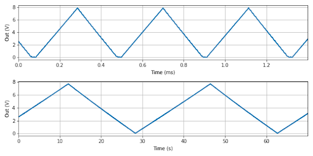 The Loop switch internally connects the EOC output to the Gate input, which will cause the Slope output to loop forever. By adjusting Rise and Fall rates, the speed of the LFO can be set, and the shape can be varied between rising ramp, triangle and falling ramp. In loop mode the LFO can go up to several kHz in frequency, and down to cycles lasting 10s of seconds. Even slower LFO rates can be achieved by feeding a fixed voltage to the CV inputs, and adjusting the CV controls counter-clockwise.